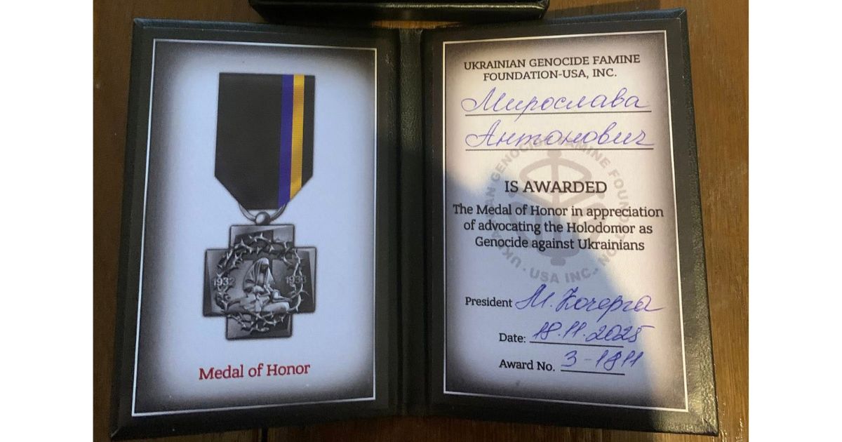 Мирослада Антонович удостоєна Медалі Пошани Фундації США з геноцидного голоду в Україні