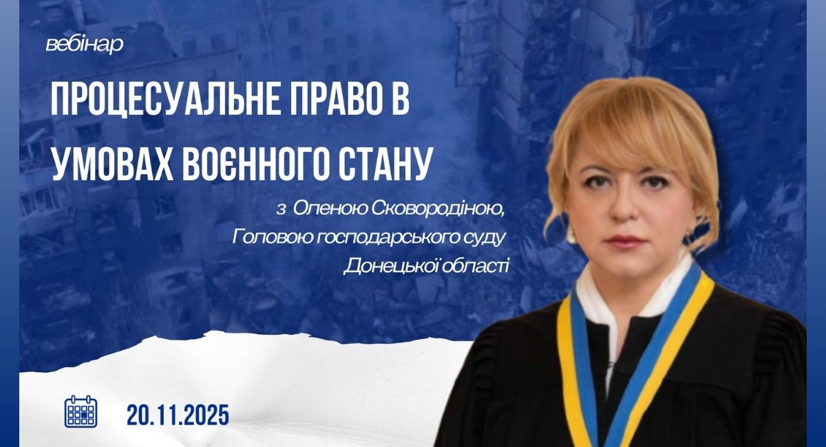 20 листопада відбувся вебінар Олени Сковородіної, Голови Господарського суду Донецької області на тему «Процесуальне право в умовах воєнного стану». Зустріч стала нагодою обговорити те, що зазвичай лишається «за кадром» суддівської роботи, – як функціонує правосуддя в умовах війни, коли держава щодня стикається з новими правовими, моральними та управлінськими викликами.